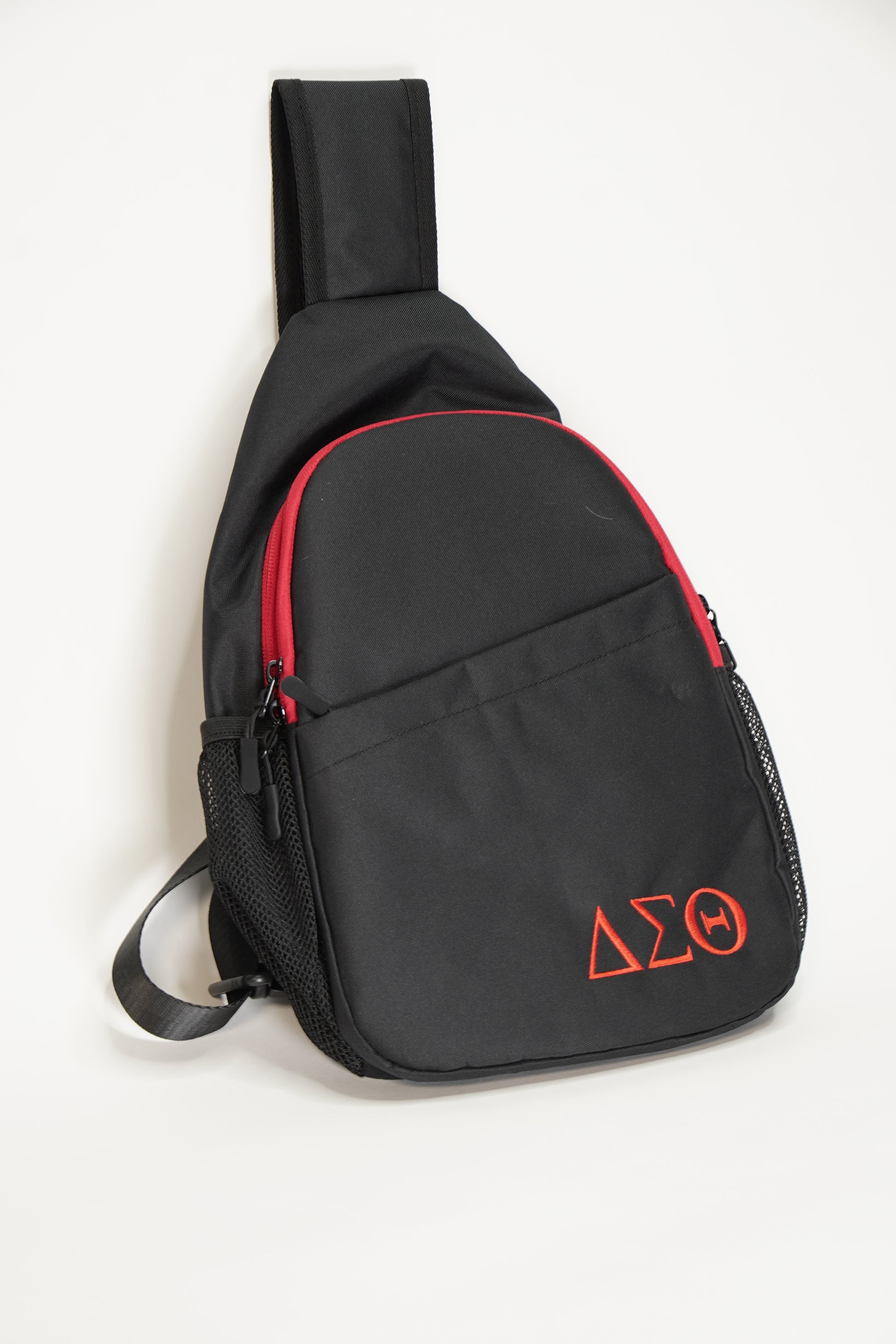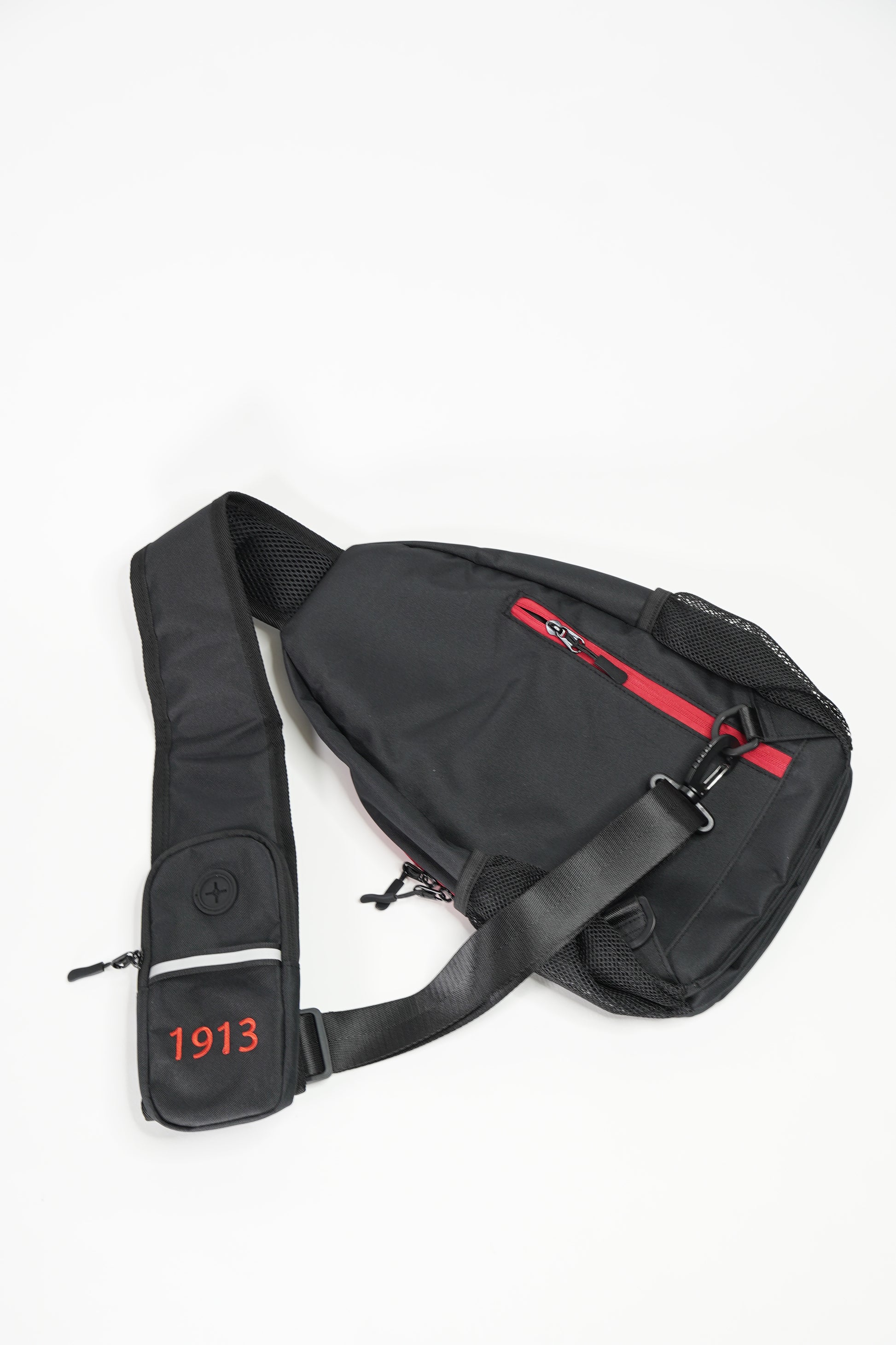 Be prepared to hold a lot in this compact sling. This branded bag also has a phone compartment.